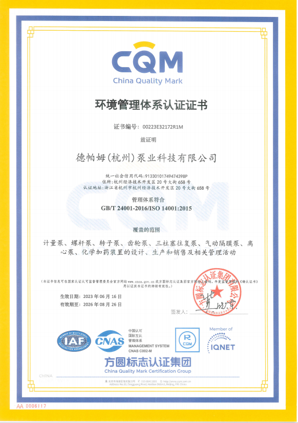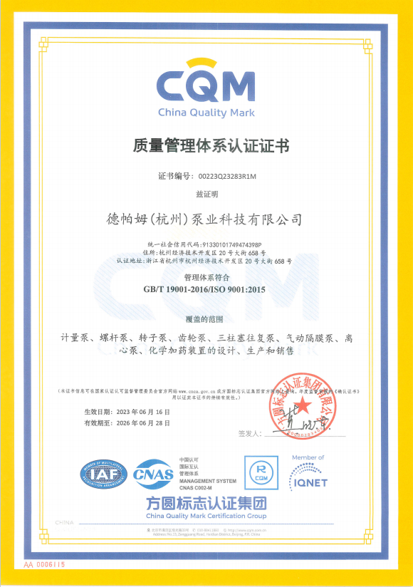 德帕姆(杭州)泵業(yè)科技有限公司地處國家級(jí)經(jīng)濟(jì)技術(shù)開發(fā)區(qū)所在地——杭州錢塘區(qū),成立于2003年,是一家集研發(fā)、生產(chǎn)、銷售于一體的高新技術(shù)企業(yè)。主要產(chǎn)品有計(jì)量泵(柱塞/機(jī)械/液壓)、高壓過程往復(fù)泵(柱塞/隔膜/管式)、電動(dòng)隔膜泵、氣動(dòng)隔膜泵、加藥裝置、水汽取樣裝置、超臨界流體設(shè)備、水處理設(shè)備等。旗下?lián)碛锌四崃_瓦(杭州)工業(yè)設(shè)備有限公司及戴勒普(杭州)流體控制科技有限公司兩家子公司??四崃_瓦主要生產(chǎn)高端螺桿泵(單/雙/三)、轉(zhuǎn)子泵(金屬/橡膠)、齒輪泵等產(chǎn)品。戴勒普主要生產(chǎn)高端離心泵系列產(chǎn)品。